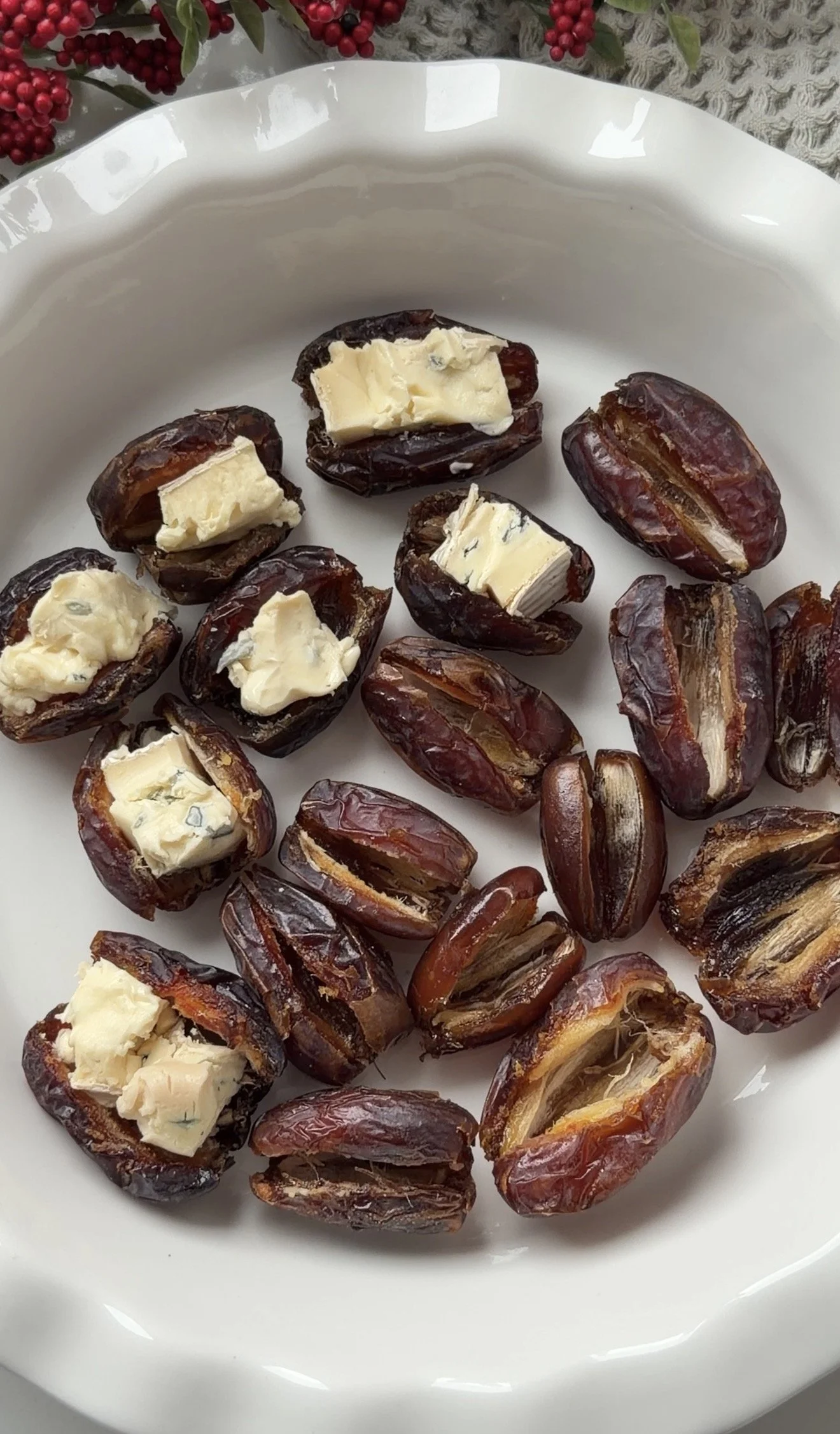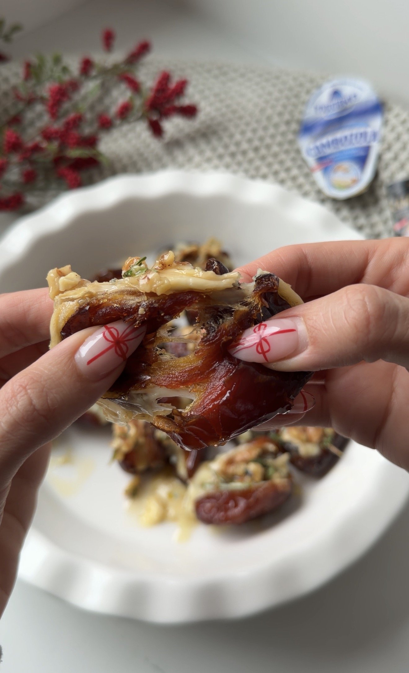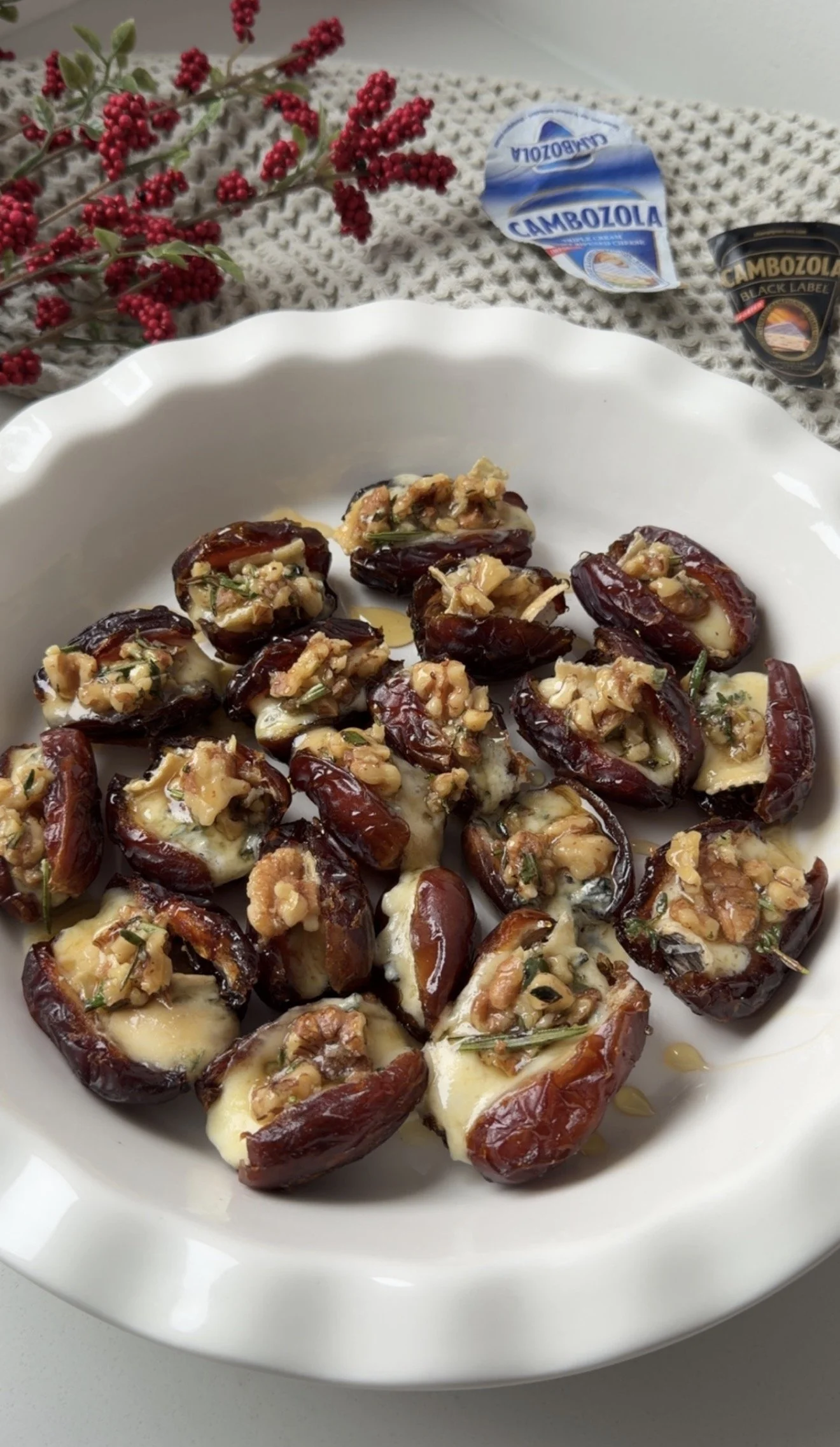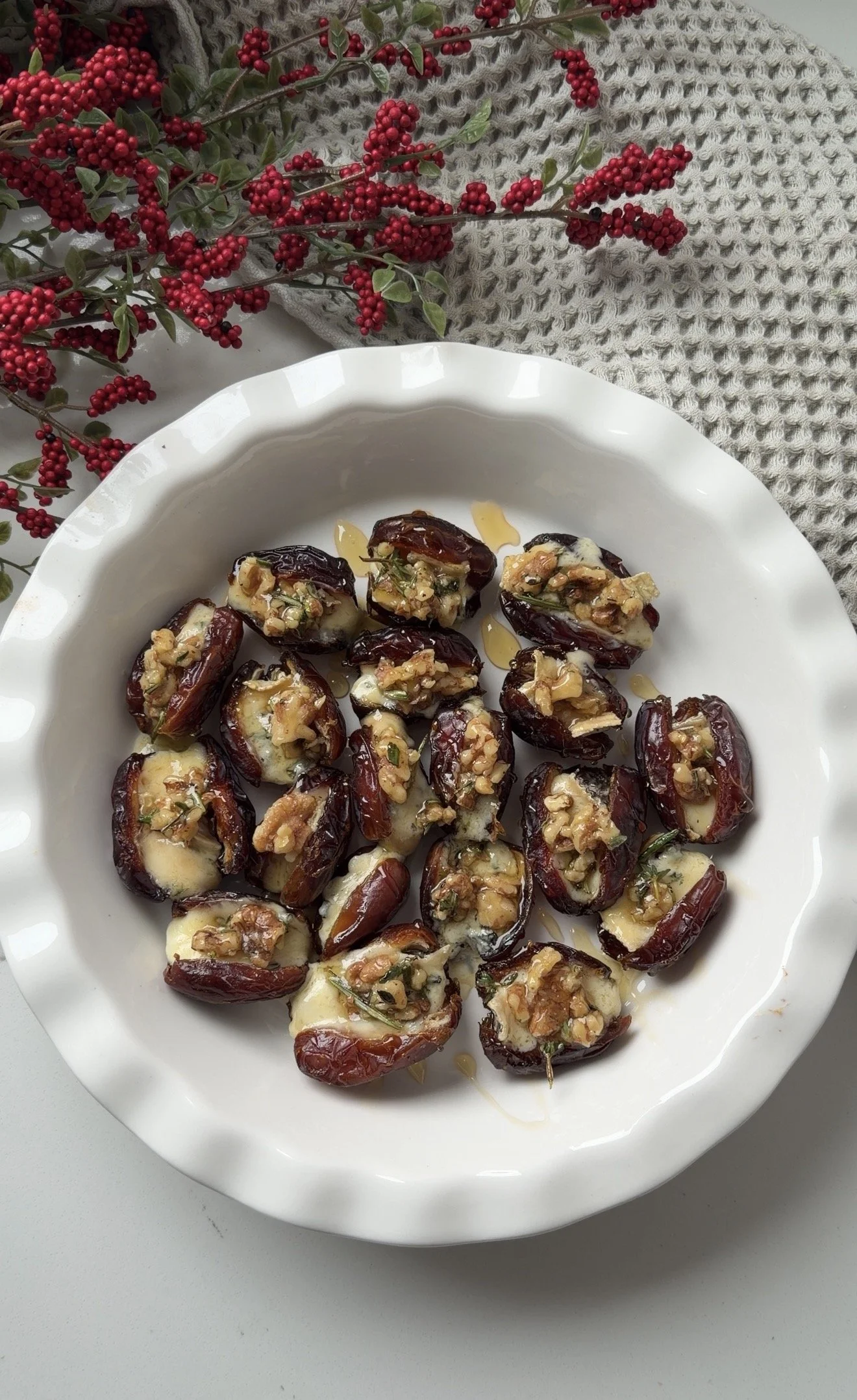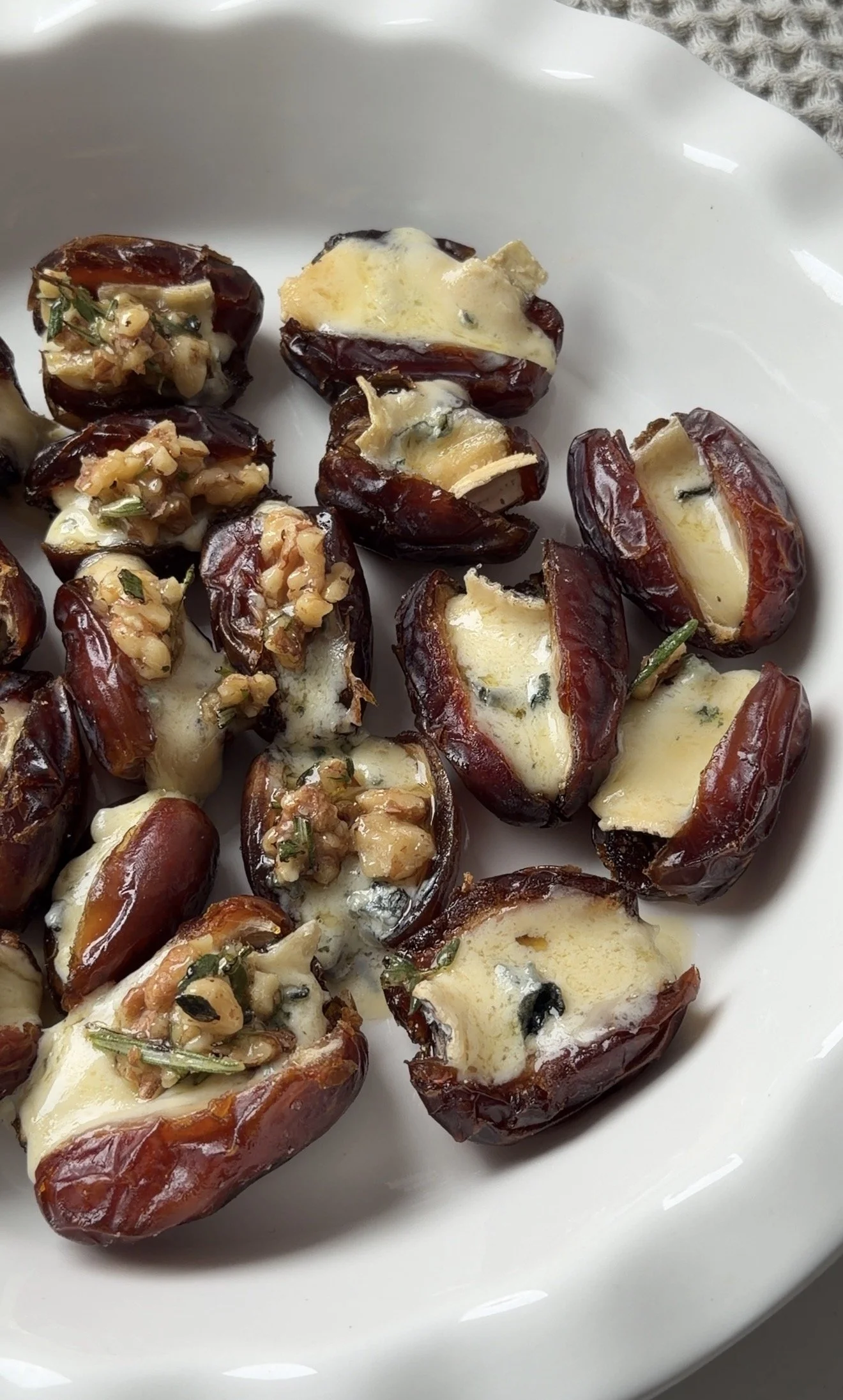 Blue cheese stuffed into sweet dates and baked in the oven until melty and caramelized are the perfect bite! Serve these up with a drizzle of honey and crushed walnuts and you have yourself the perfect bite sized appetizer for any get together.