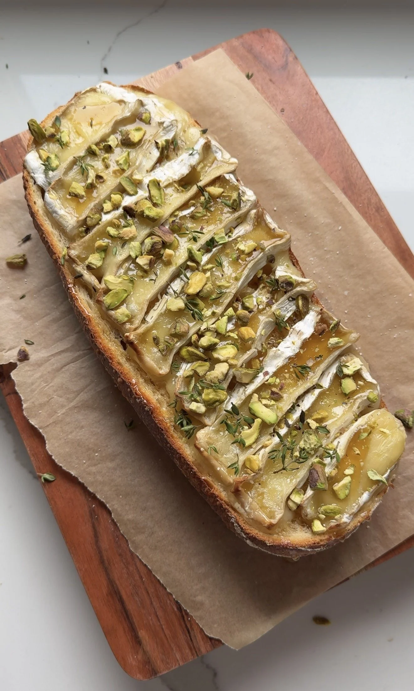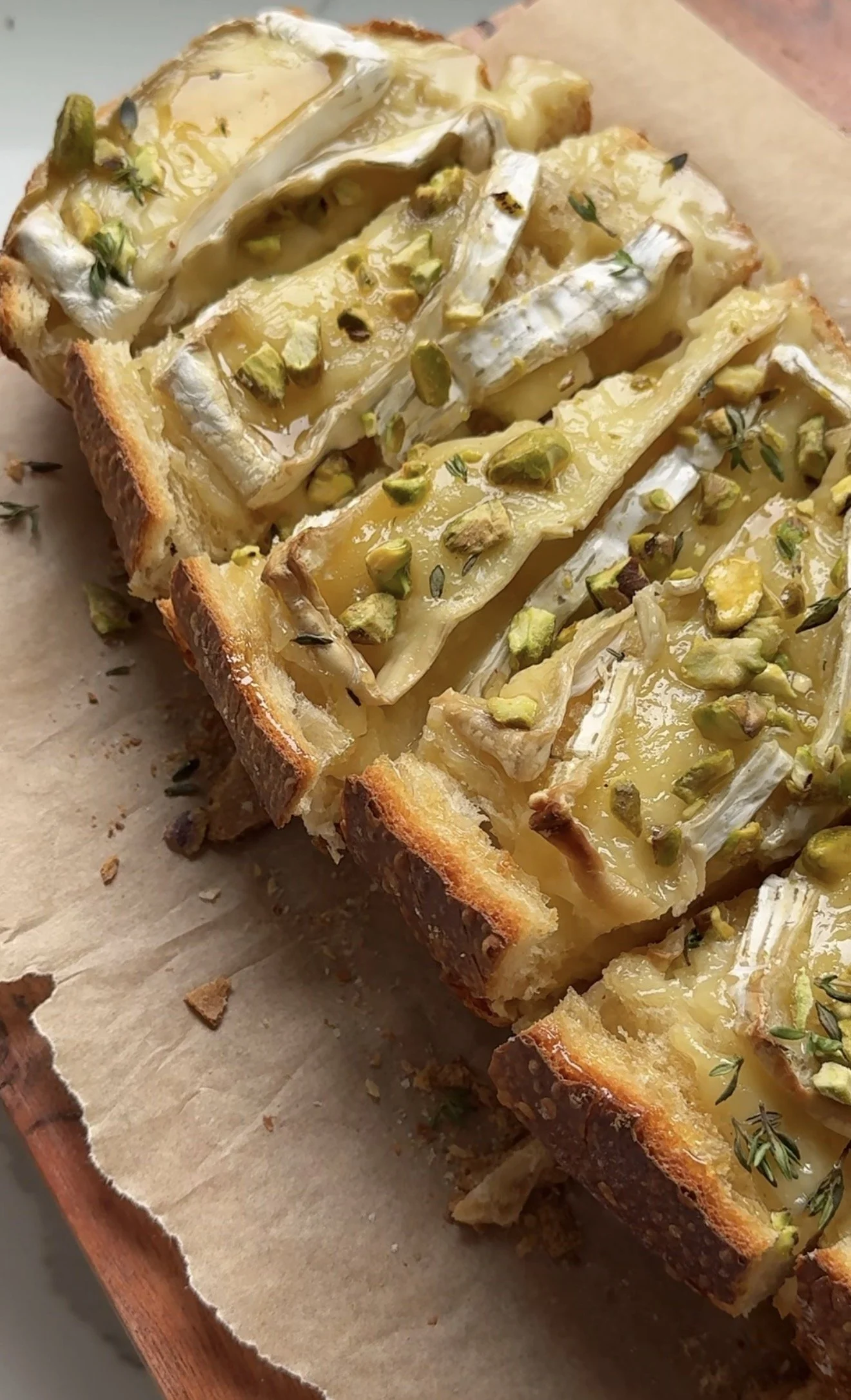 - Out of the oven garnish with a drizzle of honey, crushed pistachios and fresh thyme and enjoy!