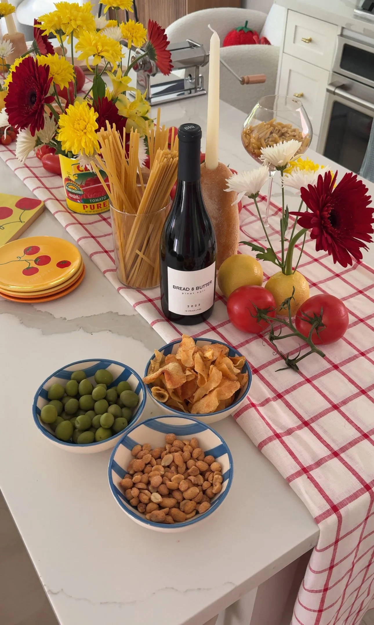 DON’T GO OVERBOARD WITH DECOR- you do not need a whole new set of plates, cutlery and napkins for each dinner party (trust me, I know that is a hard one because I love getting new tableware). Use what you already have! I have this red and white checkered table cloth from Solino home that I just folded into a runner for this party. Instead of buying a new one, I reused what I had and made it work. You’ll also notice that I used extra lemons & tomatoes that I had within the decor for this party that I simply kept after and ate- nothing goes to waste for my parties. I also used a $1.99 baguette as a candle holder that I used to make breadcrumbs with after the party.