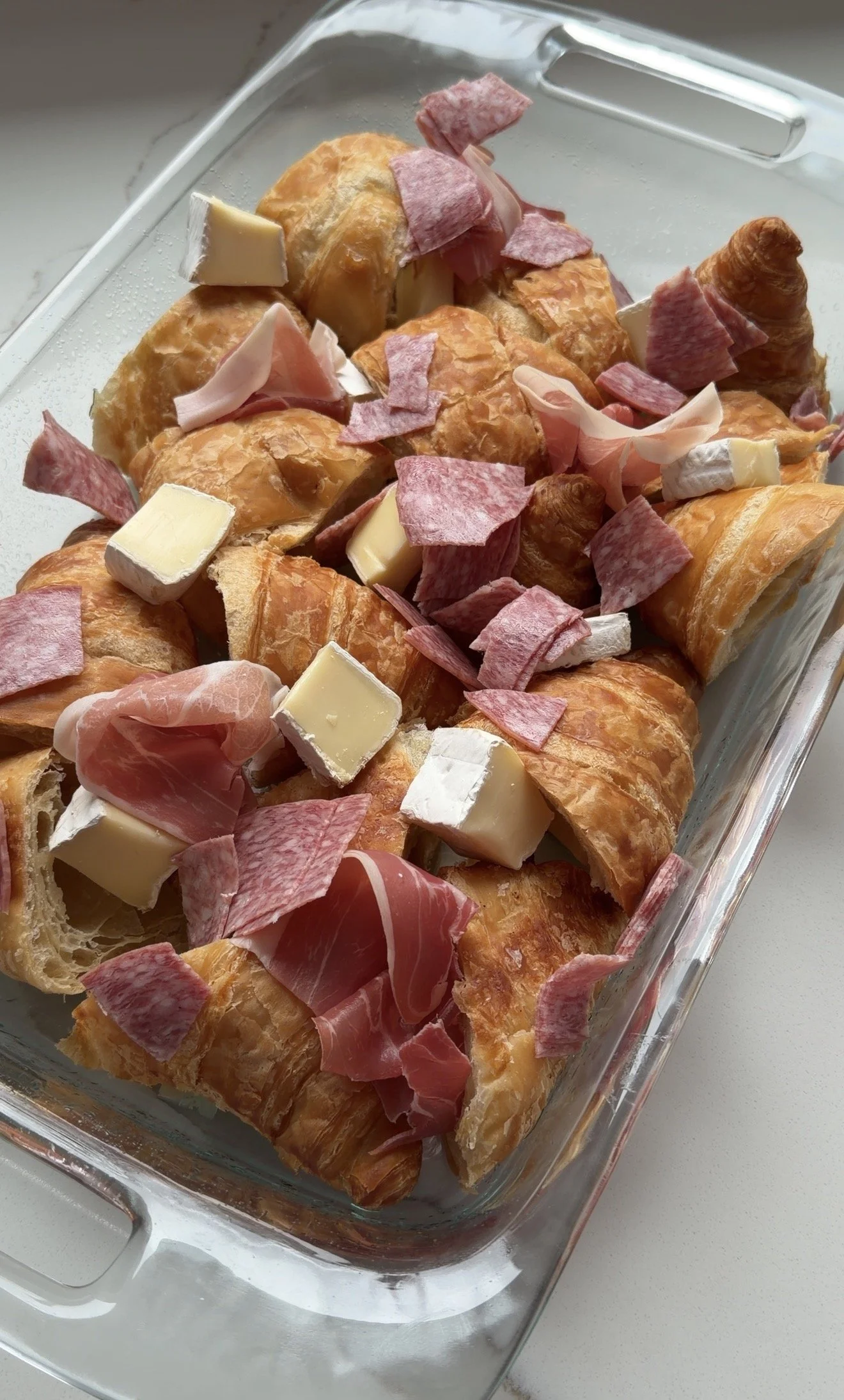 - Add in 1/2 of your cheeses, olives, salami and proscuitto then add the rest of your croissants for a second layer