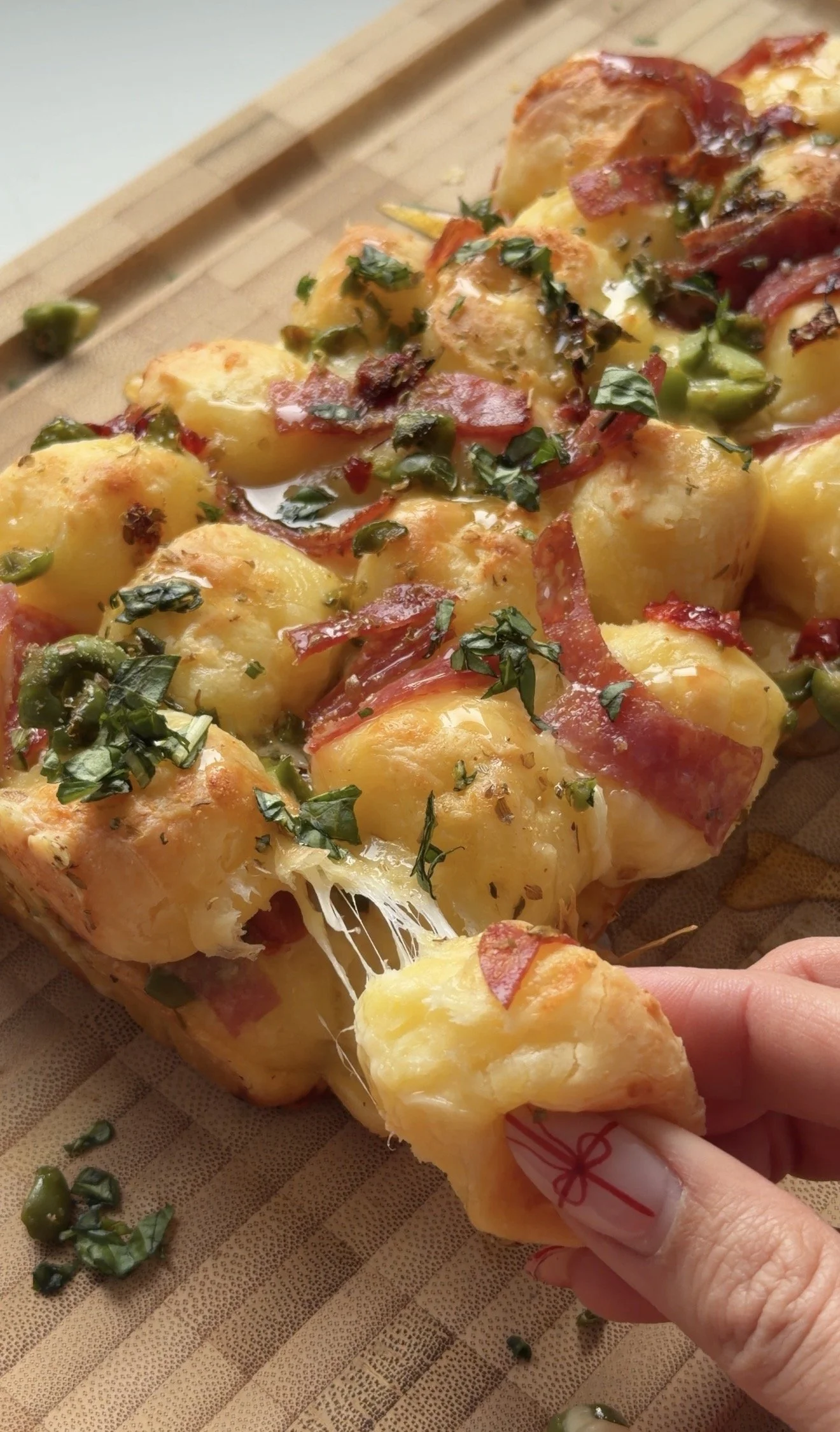 Everything you know and love about a charcuterie board stuffed alongside pillowy dough balls and baked to perfection. This charcuterie pull apart bread is easy to make and will be a hit as an appetizer!