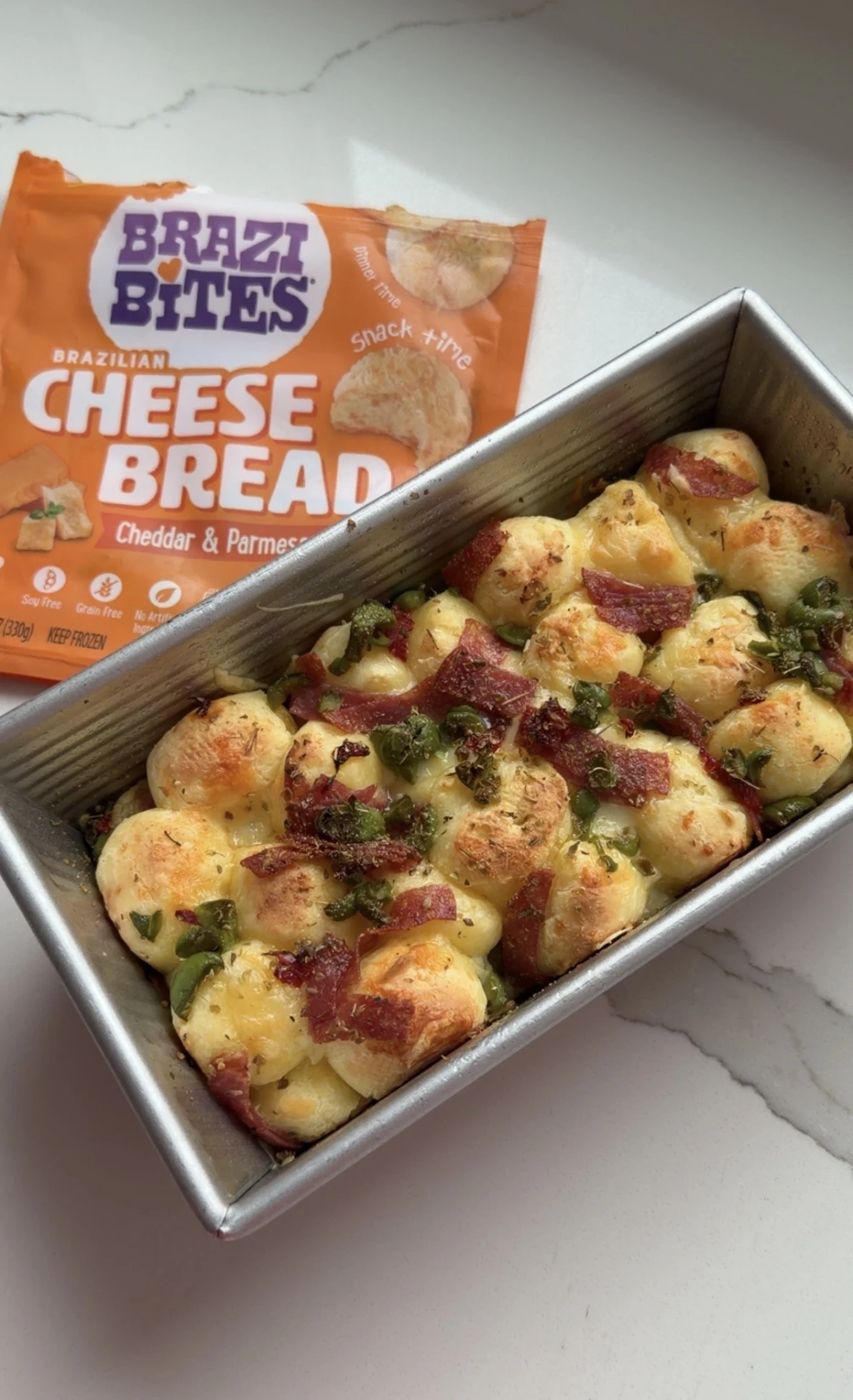 - Heat oven to 400 F and in a greased loaf pan add one bag of Brazi Bites Cheese Bread (you can also use pizza dough rolled into balls or biscuit dough)