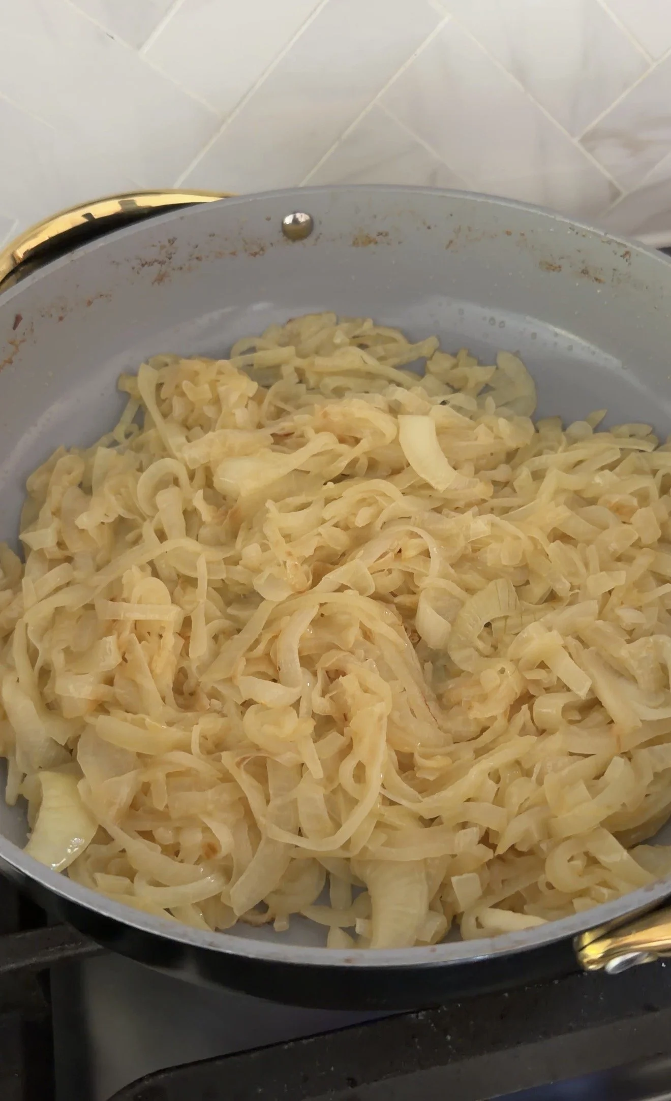 Your onions will look like this at the start- my secret is to add in some butter and sugar to them to make them caramelize quicker. Deglaze the pan as needed by adding some water to it. Cook them low and slow for about ½ hour.