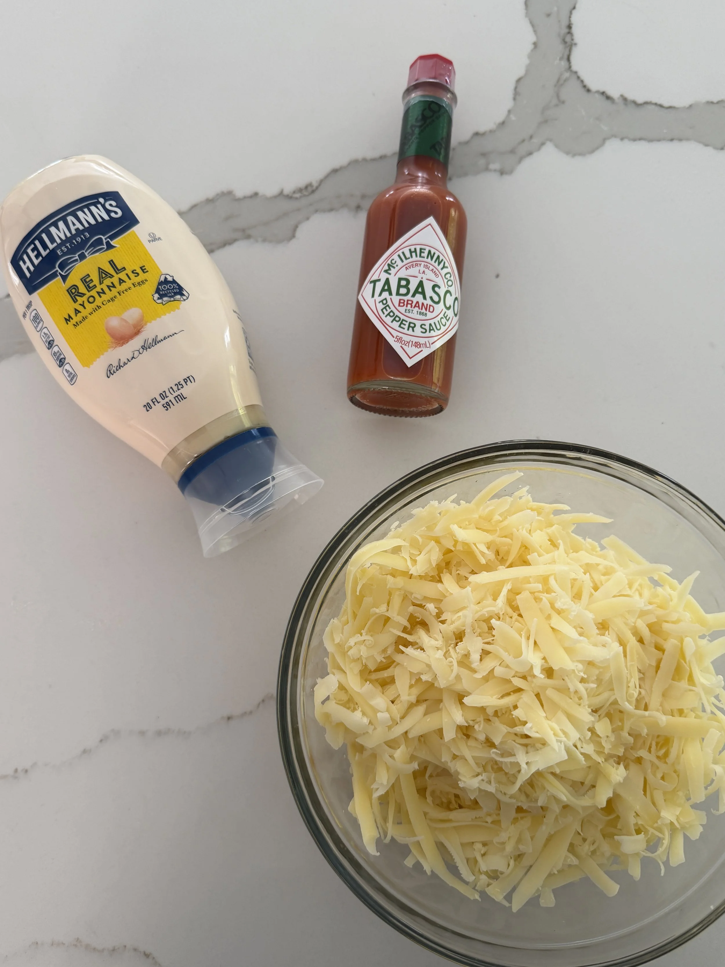 - Freshly shred your cheese and then to a bowl, add mayonnaise, sour cream, cheese, garlic, tabasco