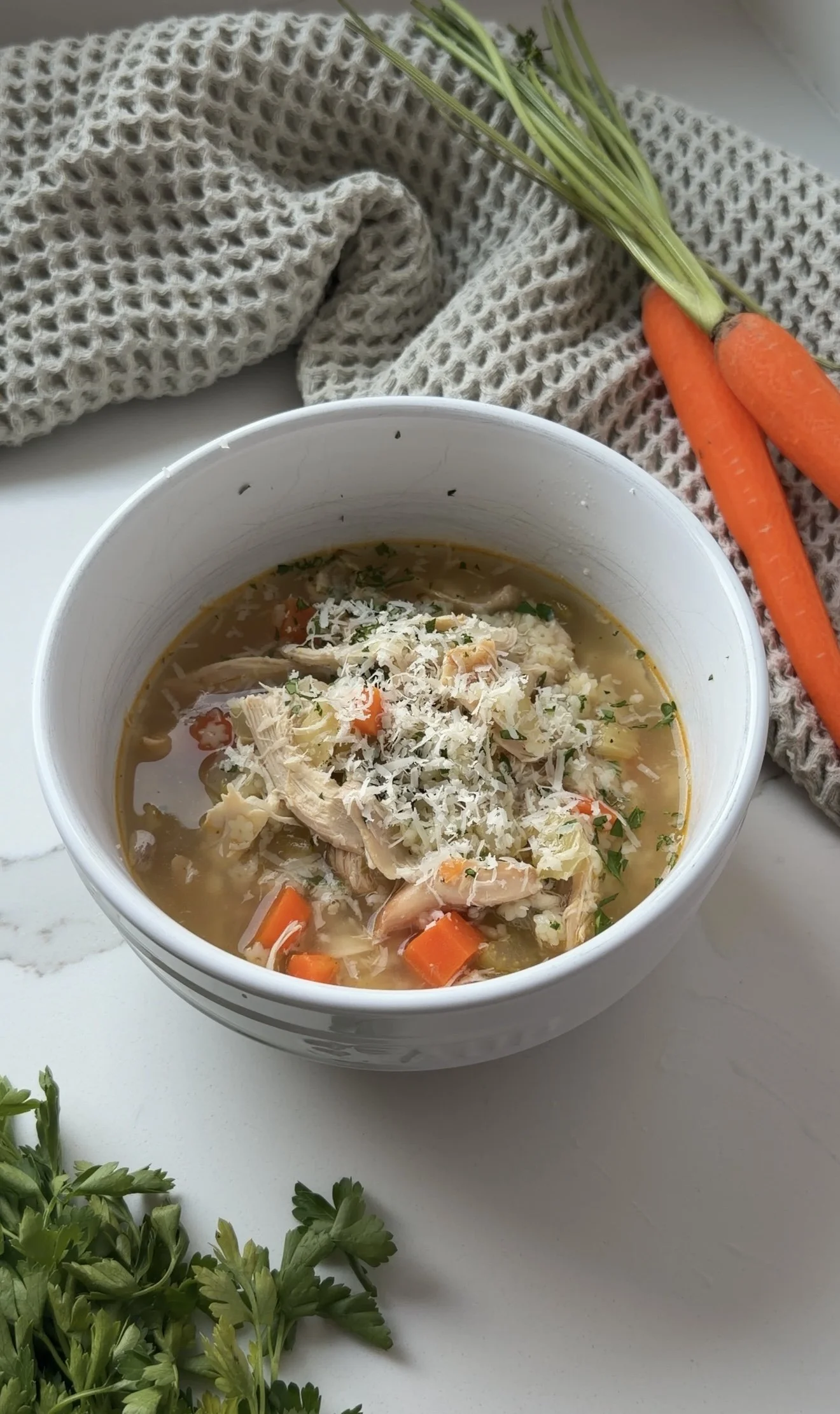 I love adding fresh parsley and grated parmesan cheese on top. This soup is EASY to prepare ahead for the week and pull out as needed. It also freezes really well if you want to make a big batch ahead and store some in a sealed container.