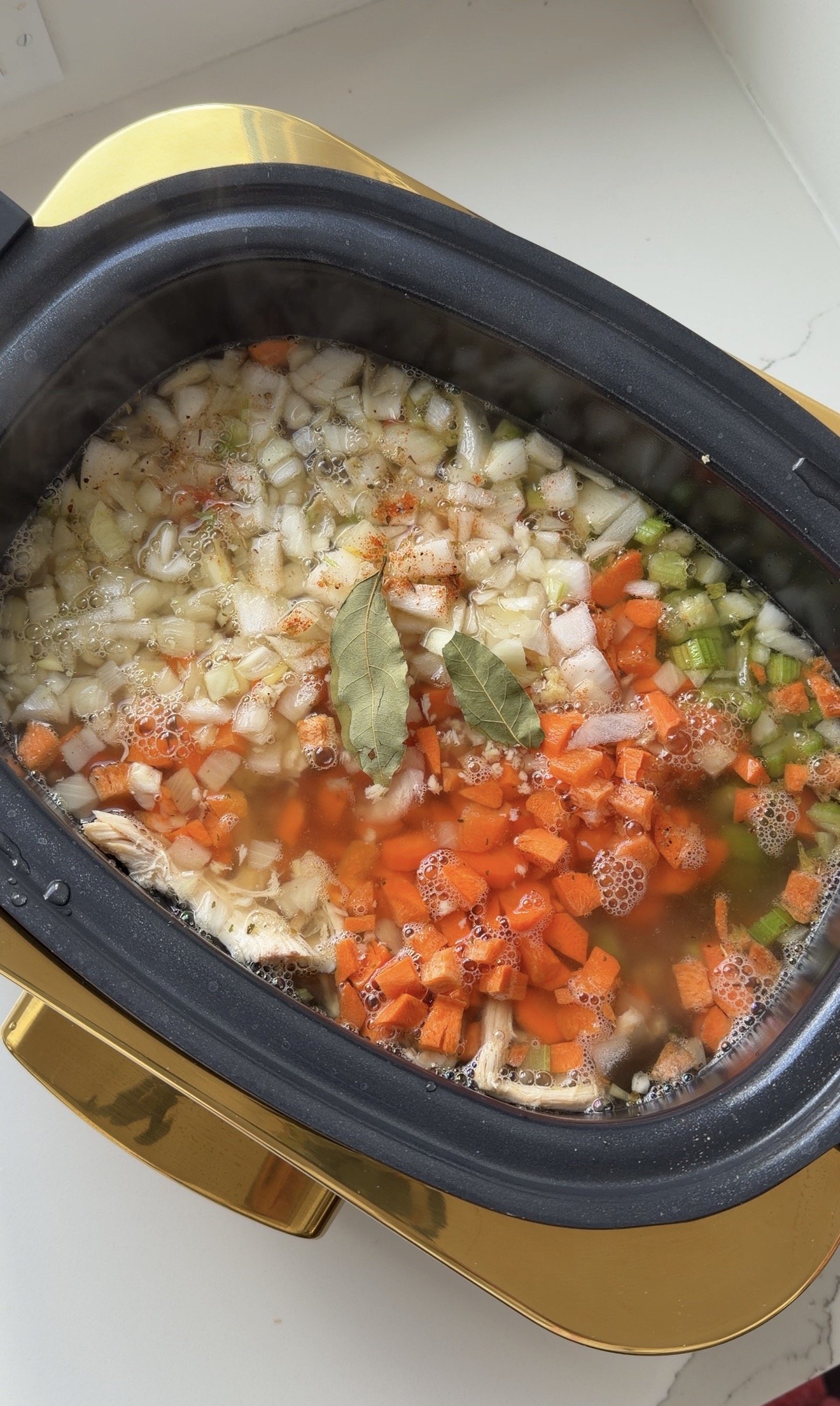 - Add in chopped carrots, celery, onions, minced garlic, seasonings and chicken broth in the slow cooker with the shredded chicken and cover with lid. Cook on LOW- 5 hours OR HIGH- 3 hours until veggies are softened.