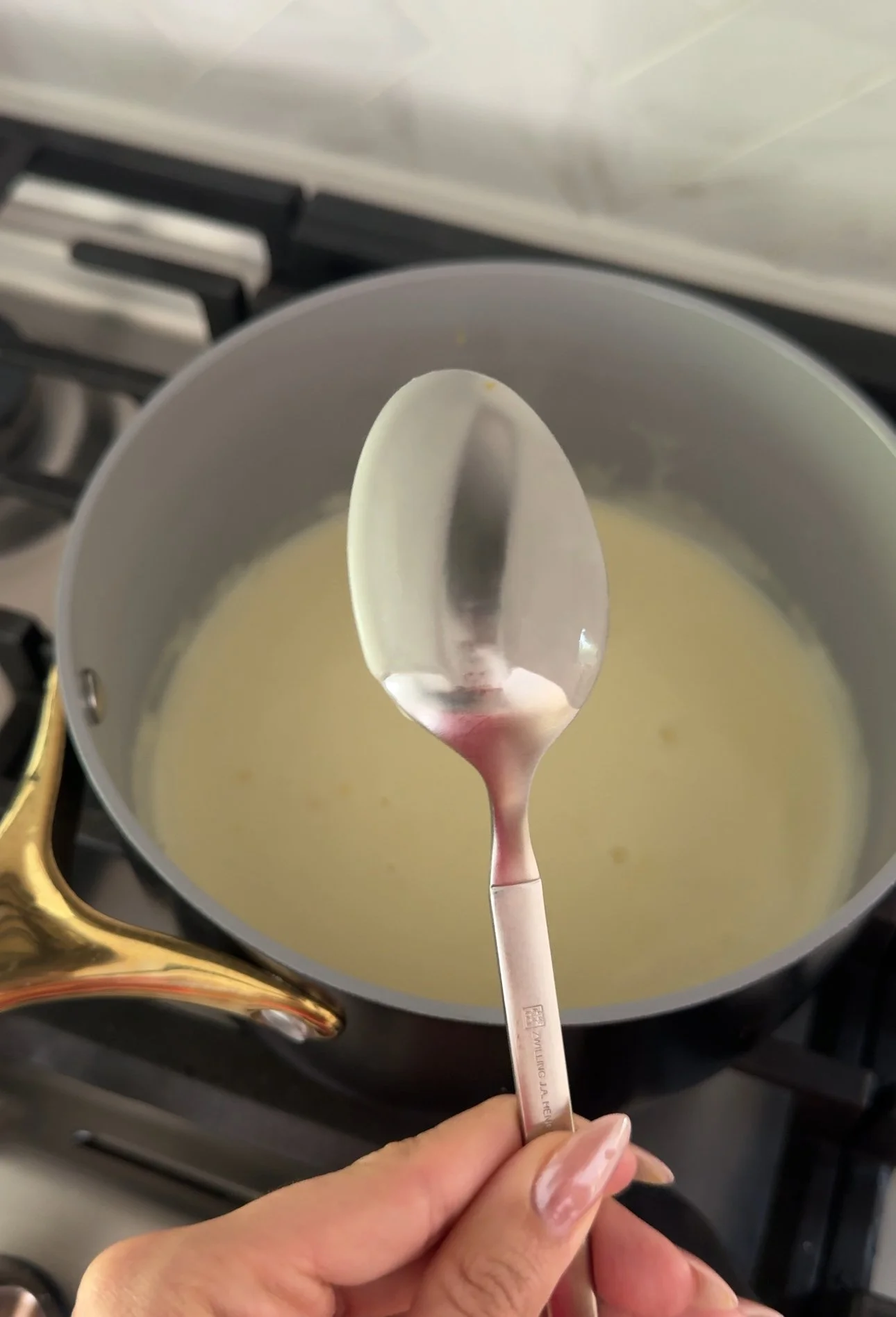 - Once this is bubbling, remove the pan from heat and slowly whisk in your lemon juice and whisk until smooth and it becomes a bit of a thicker pale yellow liquid. Once the custard coats the back of a spoon it is ready.