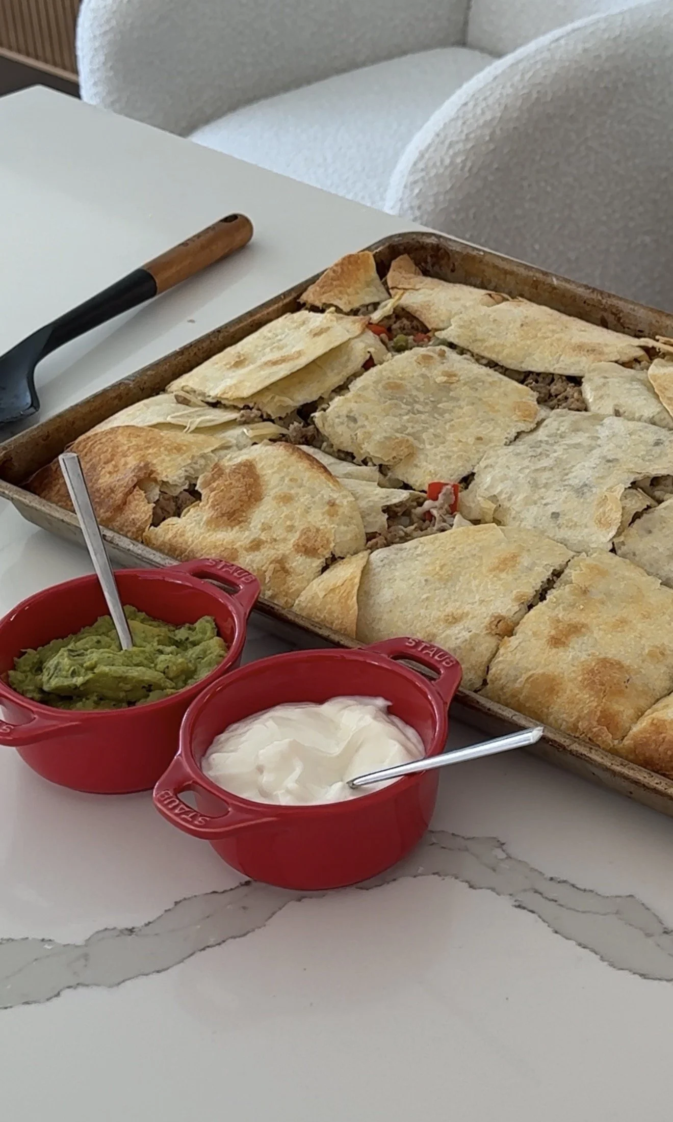 - Rest for 5 minutes and cut into squares and serve warm with guacamole, sour cream, ketchup or whatever you'd like!