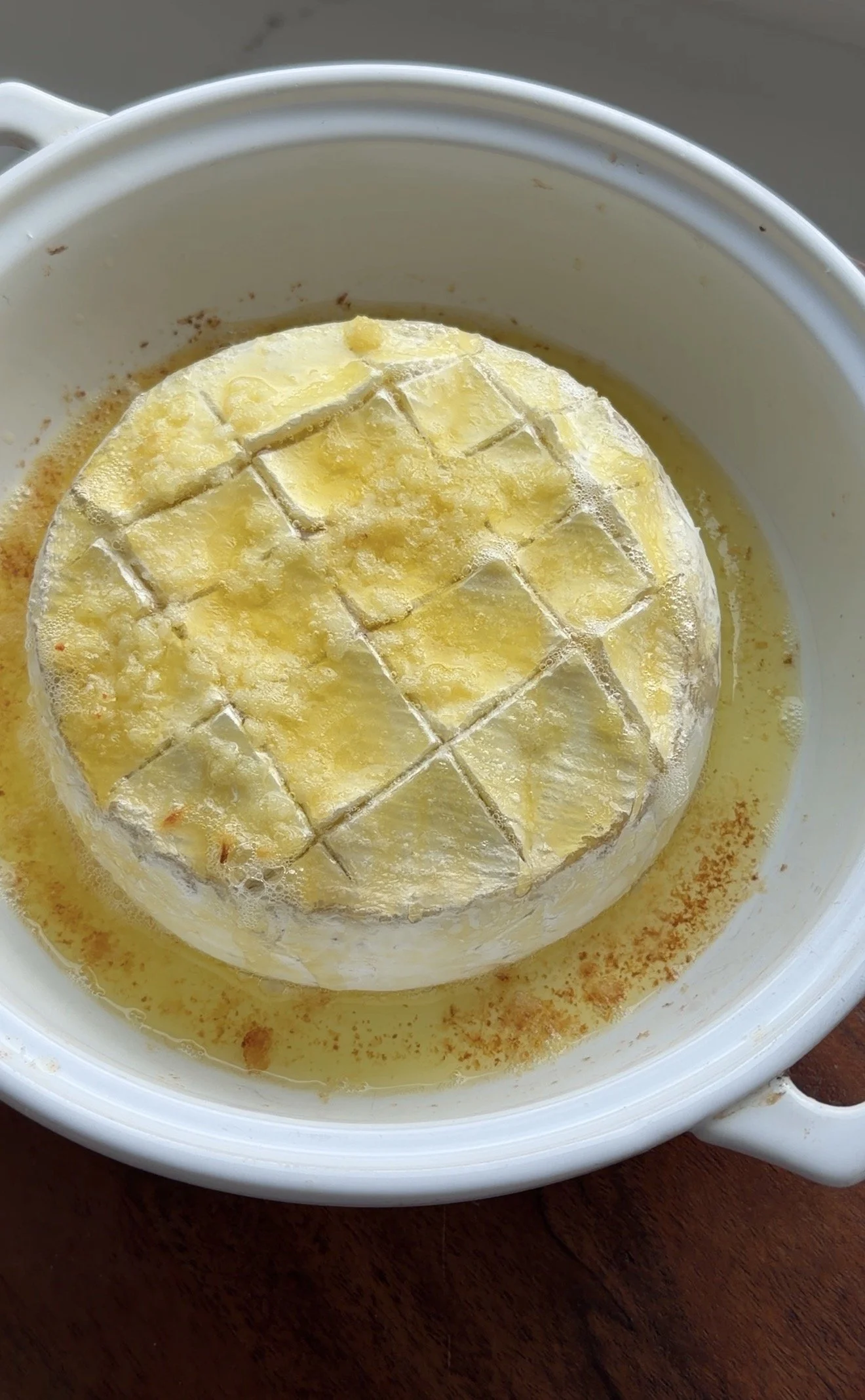 - Put your brie cheese wheel in the middle of the baking dish and score the top of it with cross hatch marks (this will allow the brie cheese to breathe and cook evenly in the oven)