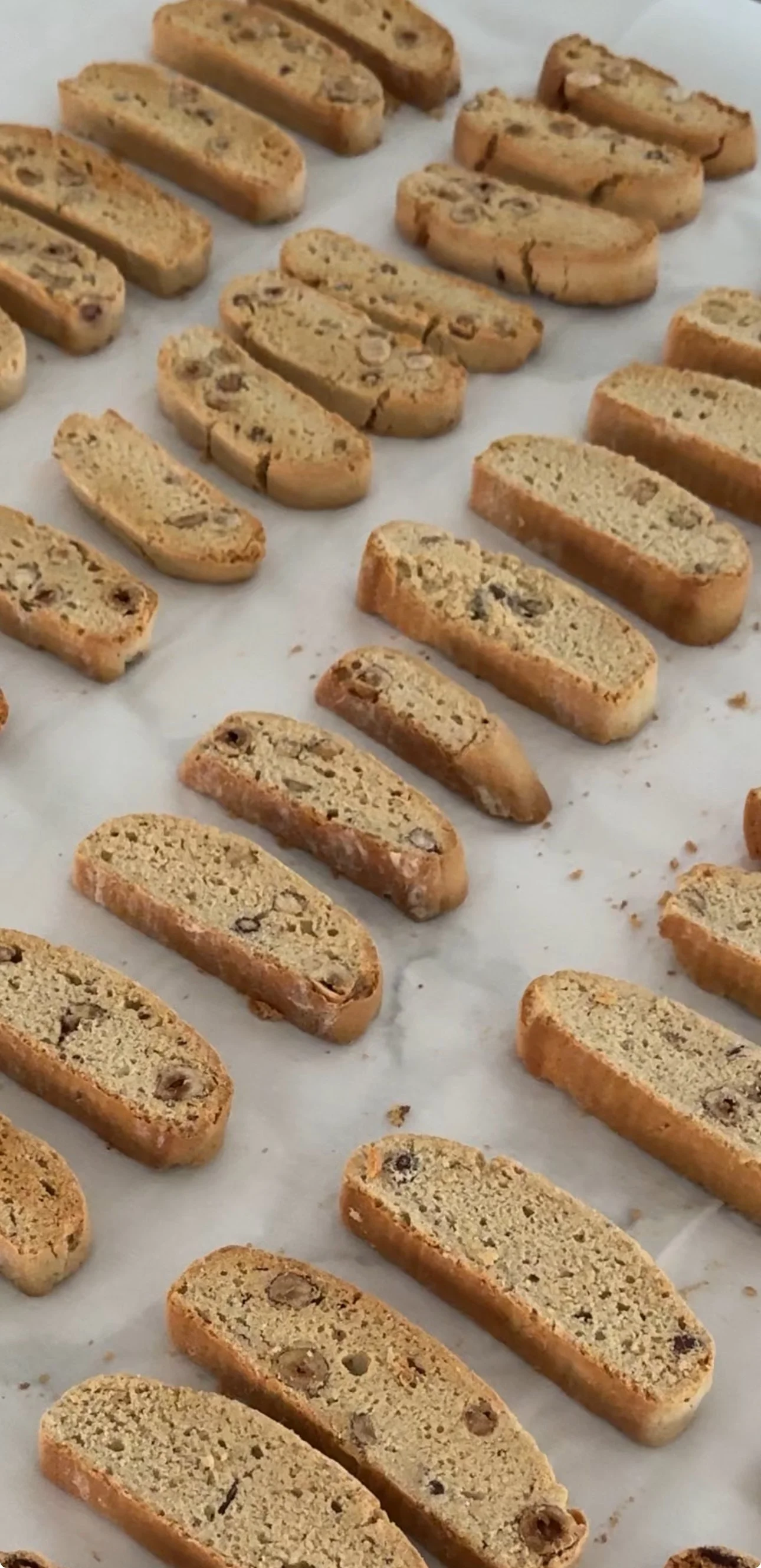 - Bake for 25 minutes or until golden brown. Carefully remove from pans and place on cooling racks. Set aside baking sheet, as it will be reused. When biscotti had cooled enough to handle, but is still warm, carefully move them to a cutting board and cut slices (approximately 1/2″ in size). You can use a knife or this electric carving knife (makes the PERFECT cuts)
