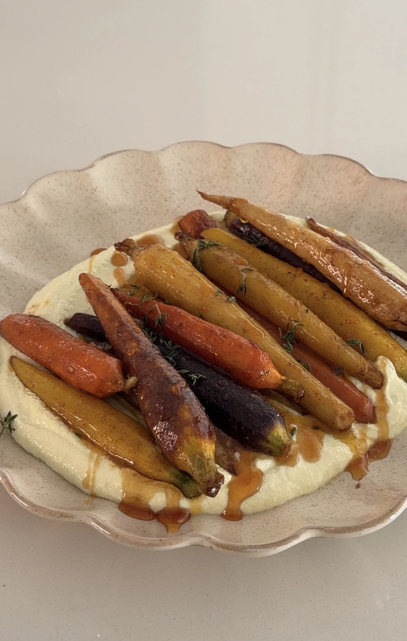 - Arrange your whipped feta on a plate and top on your baked carrots