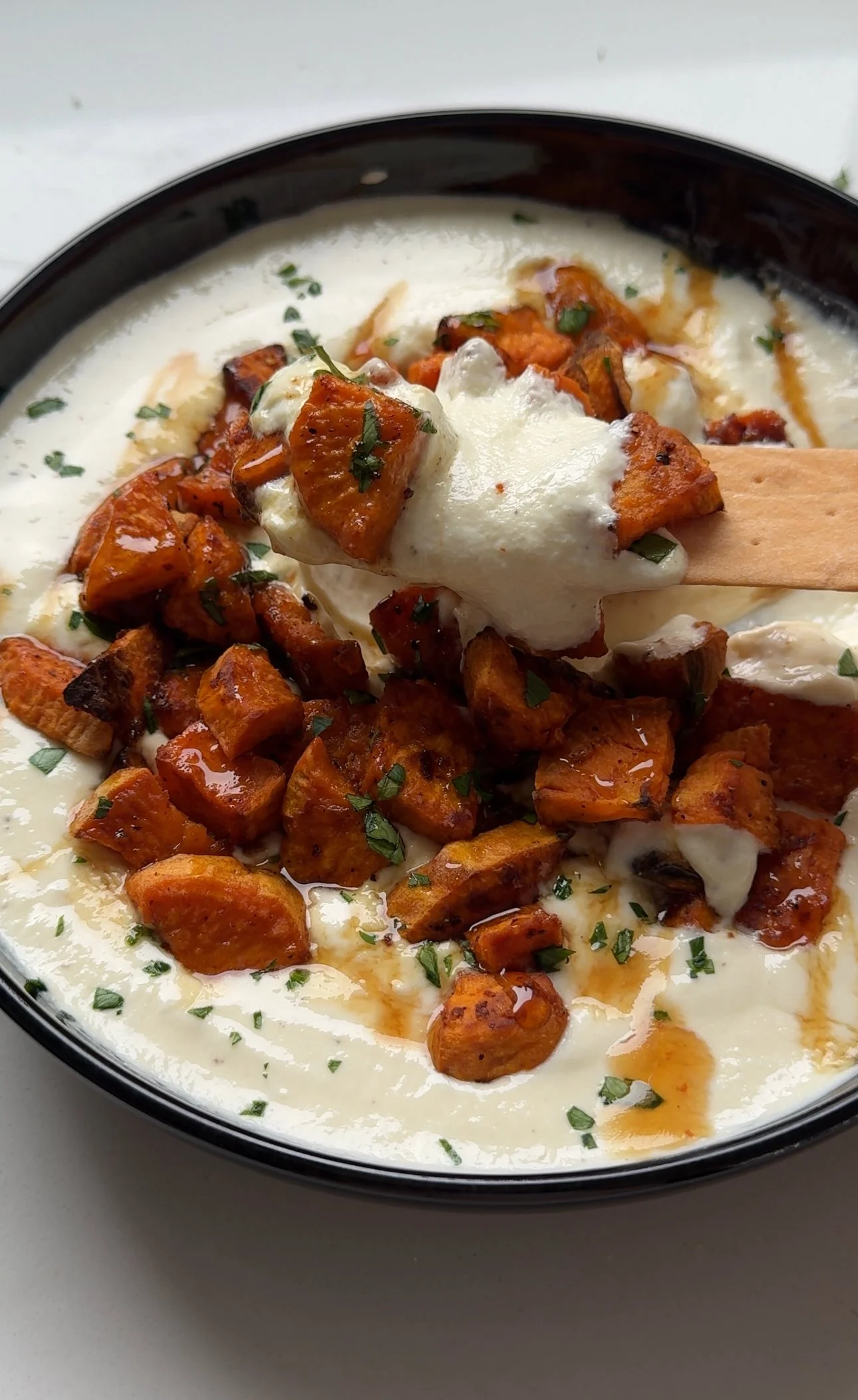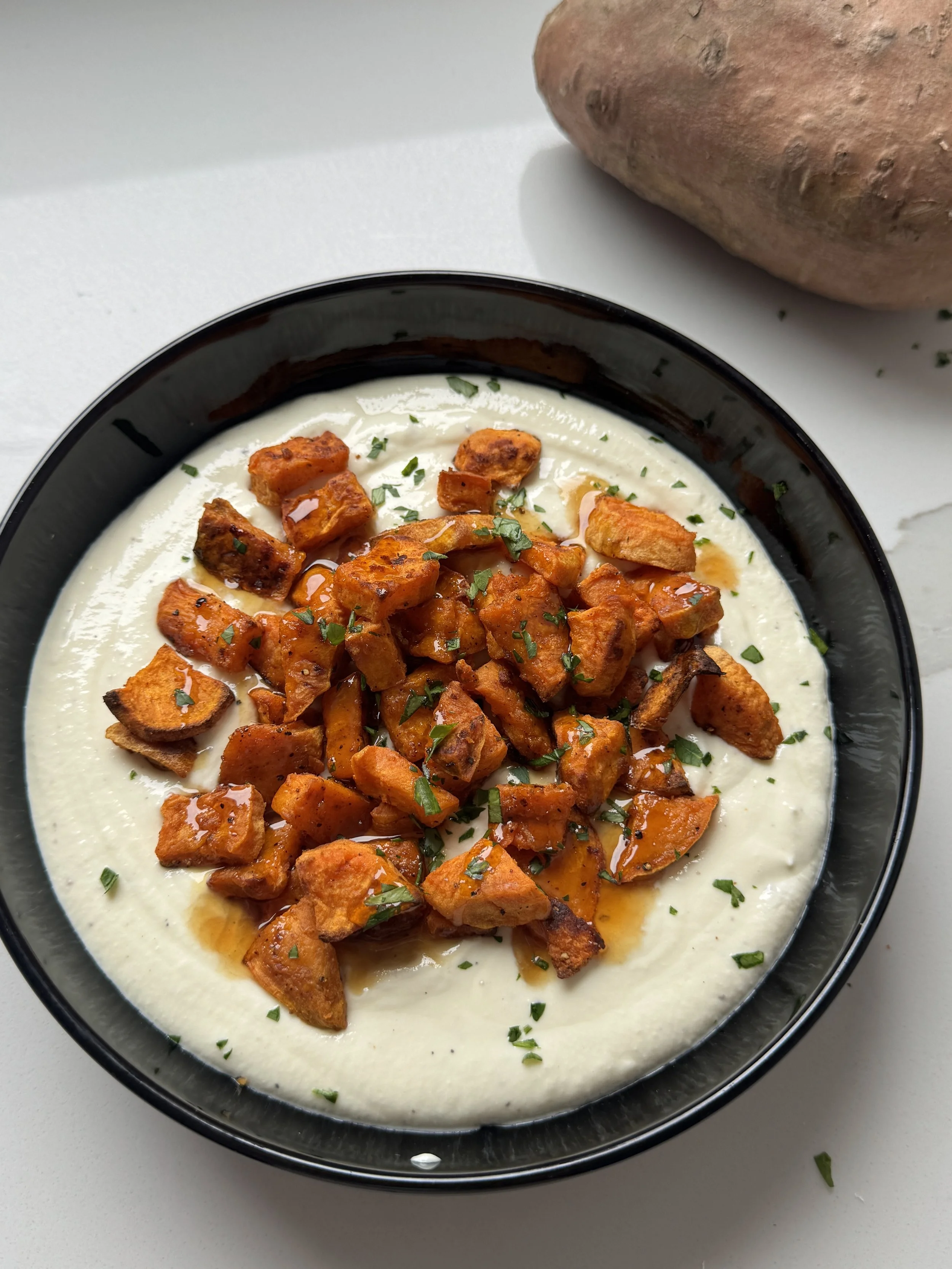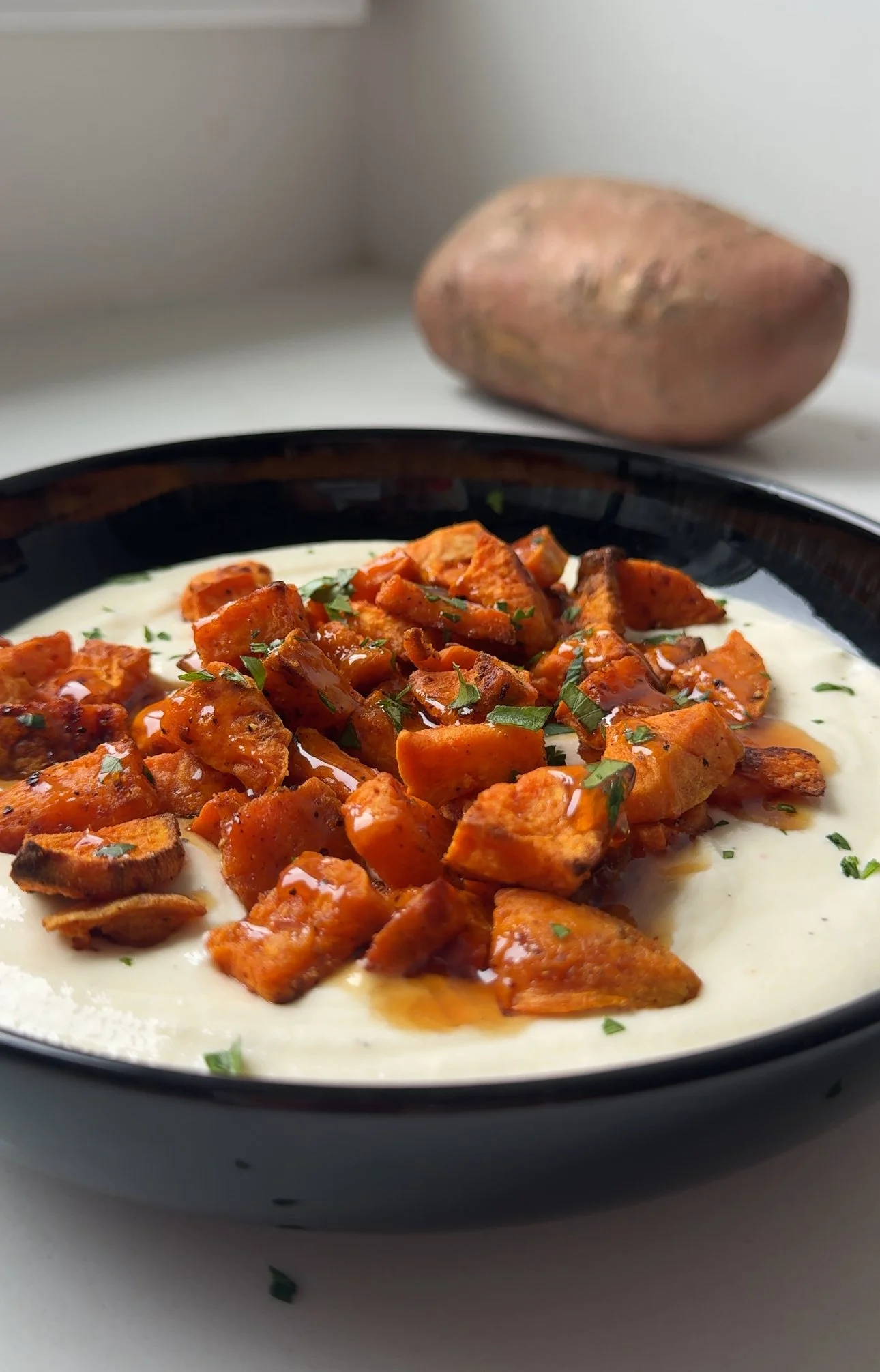Whipped feta is one of the easiest dips to make and why I love it so much is because it is so versatile in the way you can pair it with different ingredients to elevate it even more. Adding these caramelized sweet potatoes on top will really bring that whipped feta to the next level. I love serving this as an appetizer but it also makes for the perfect side dish to a roast beef dinner, turkey or chicken.