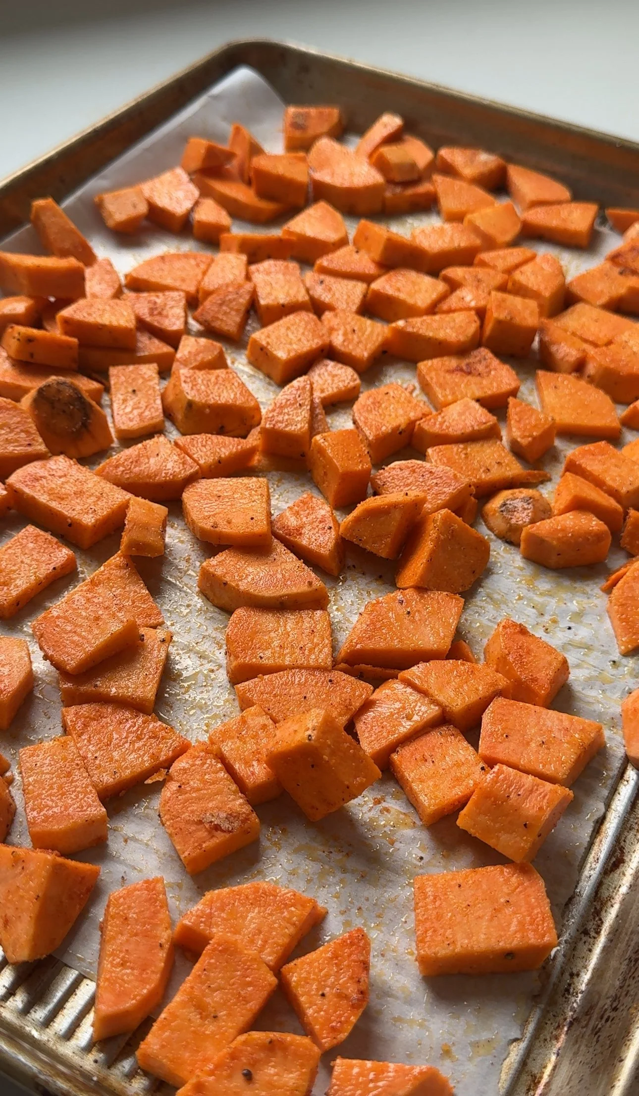- Peel the skin off and chop your American sweet potatoes into small cubes and add them on the baking sheet