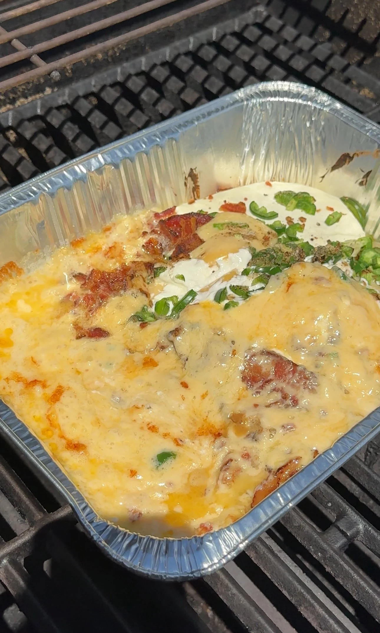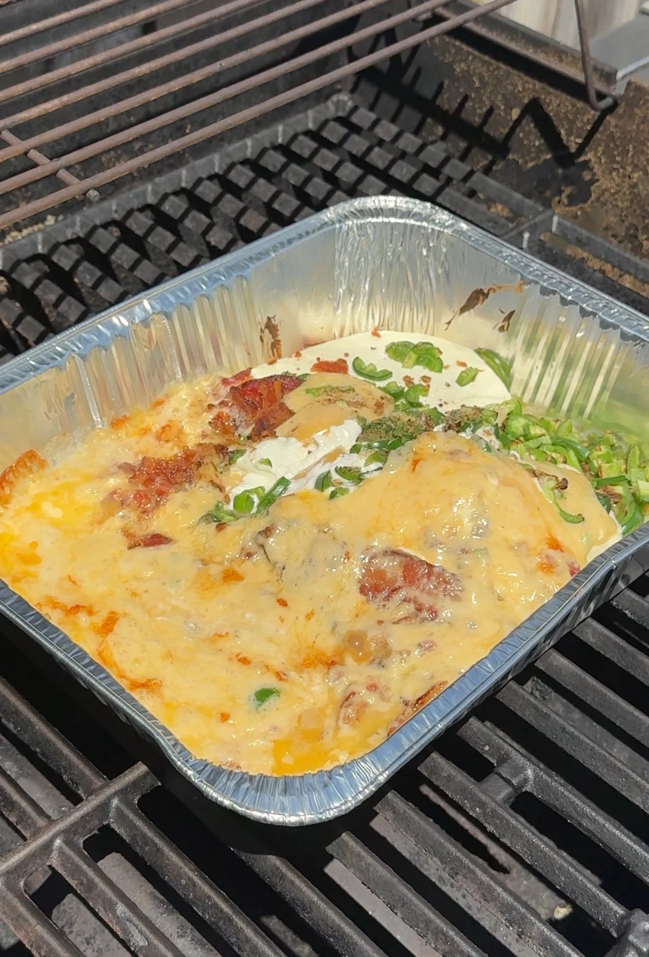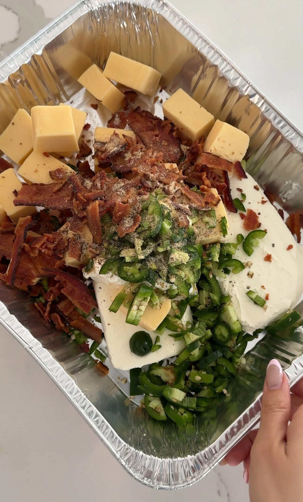 - Add cream cheese, havarti cubes, bacon, jalpenos and spices to a foil pan or skillet.