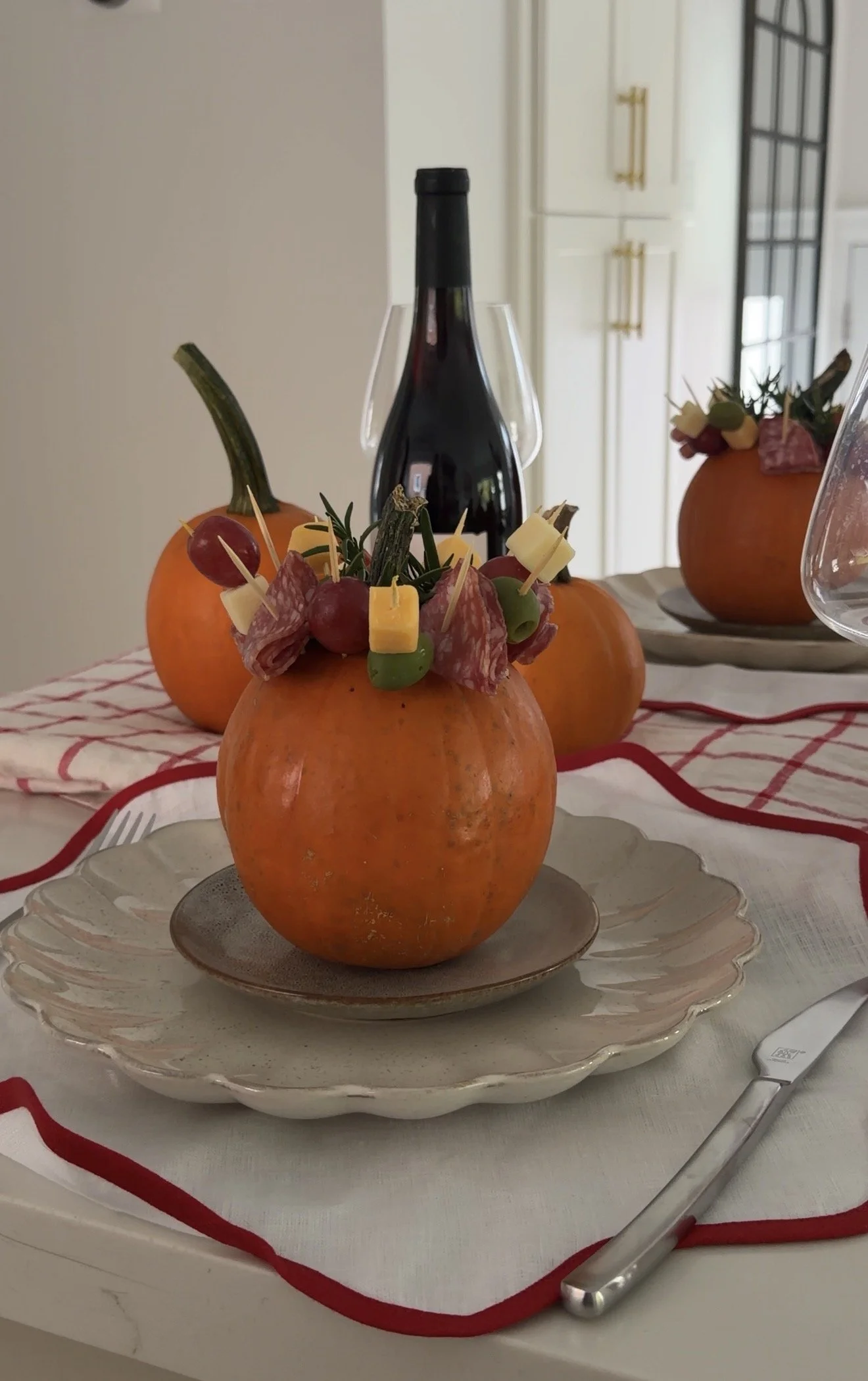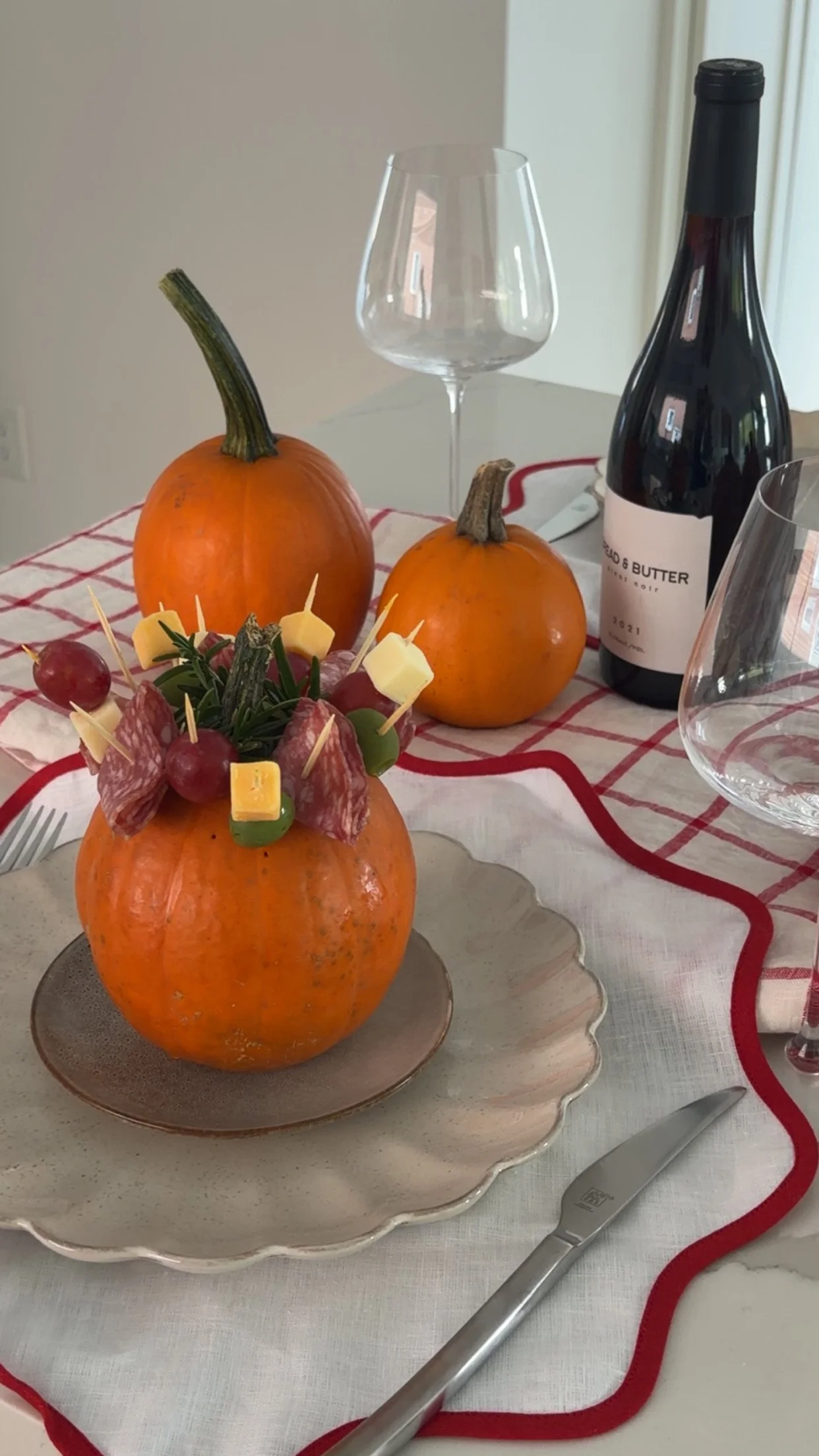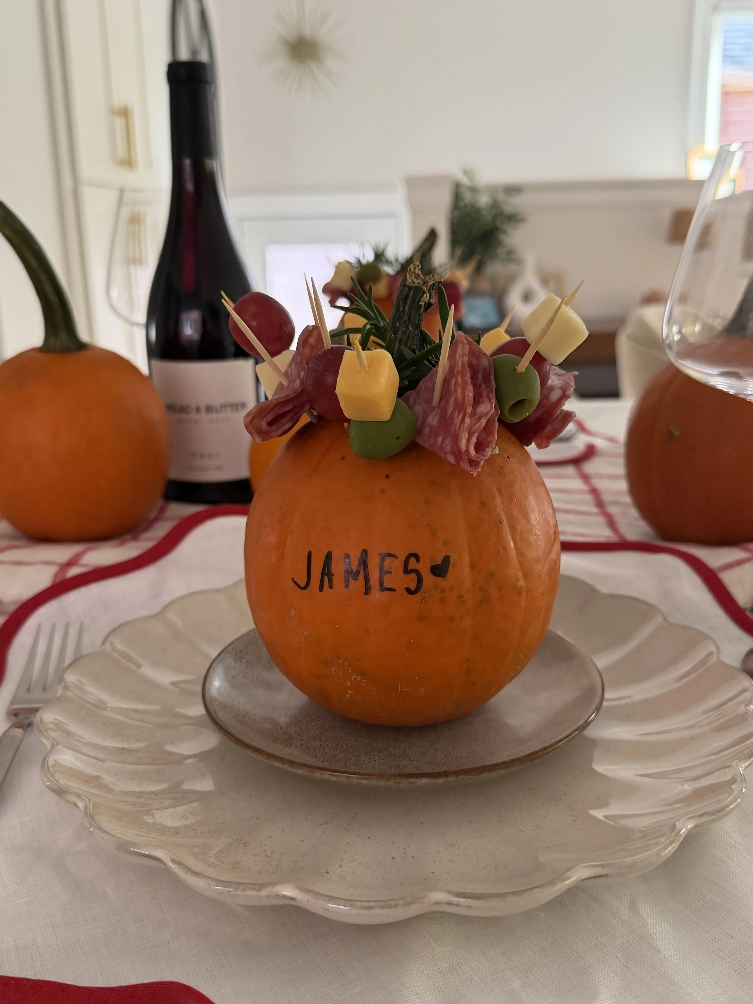 It’s so easy to make- instead of displaying charcuterie and cheese on a board, stick them in mini pumpkins with toothpicks. It will get your guests talking and give that WOW factor when hosting.