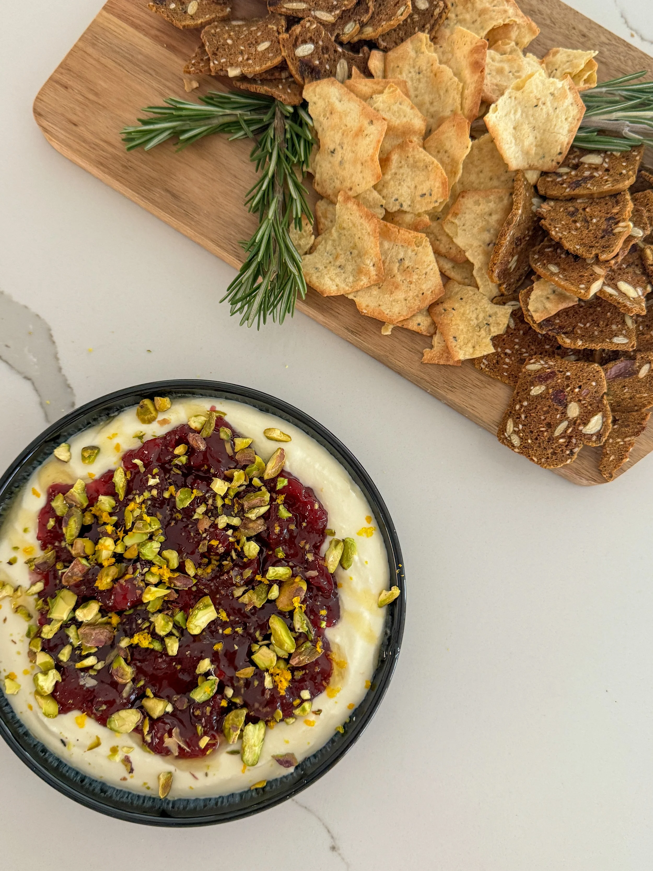 Whipped feta is a delicious as a savory dip and when topped with a cranberry compote, crushed pistachios and orange zest- you have the perfect festive holiday appetizer!